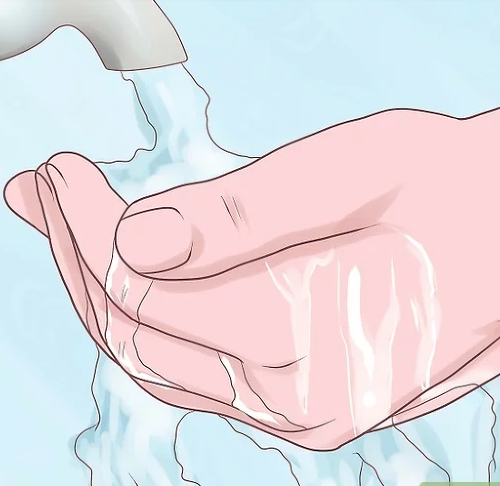 Start by washing your hands up to the wrists three times, ensuring that water reaches between the fingers.