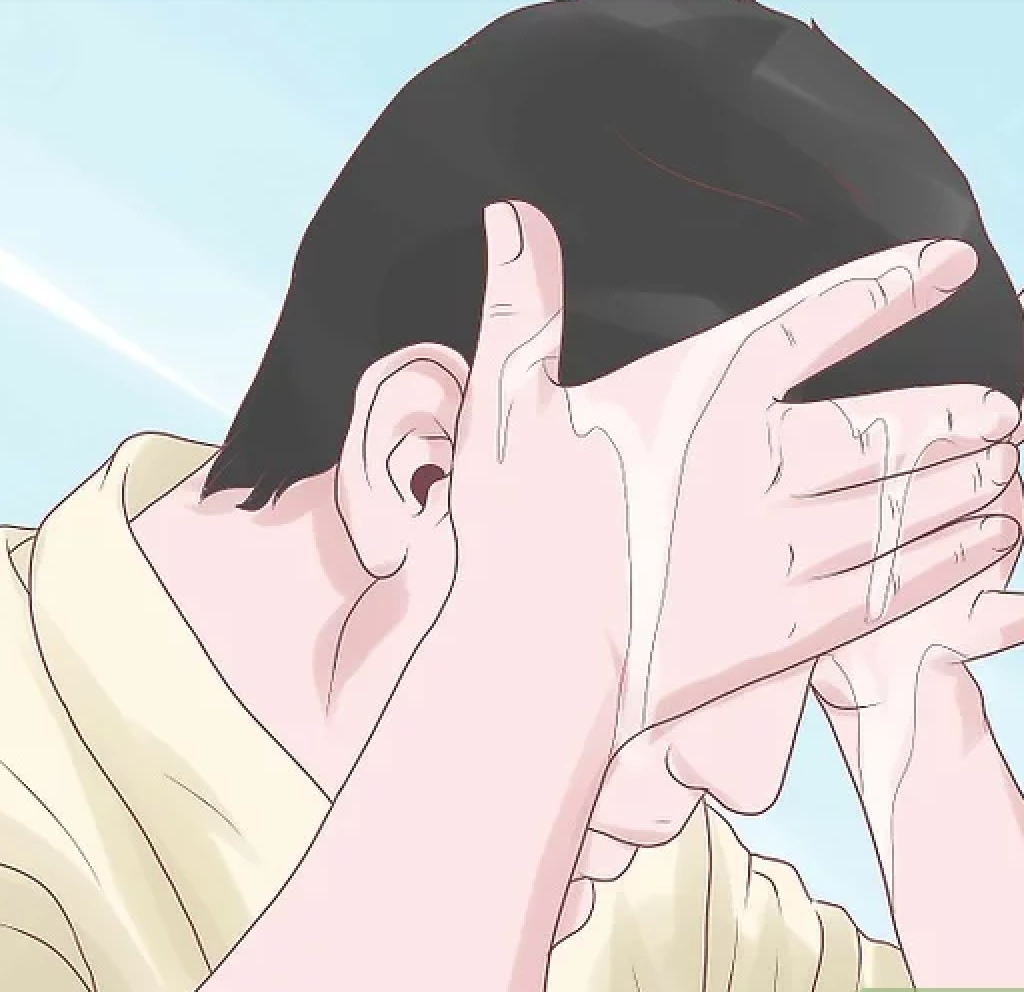With both hands, wash your face three times, from the hairline to the chin and from ear to ear, ensuring that every part of the face is covered.